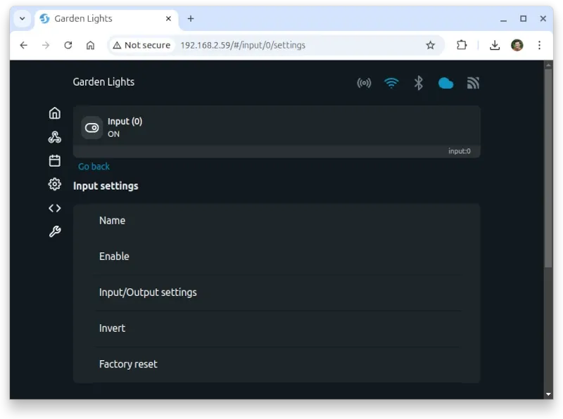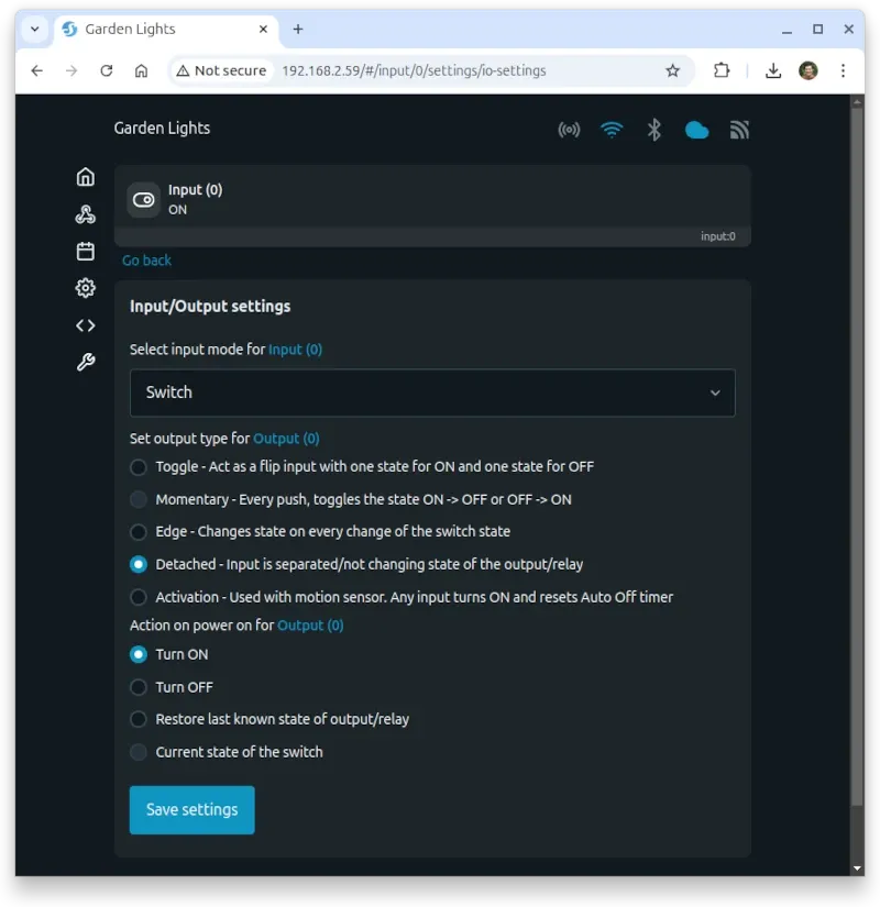 With the Shelly operating in detached switch mode, we will need to watch the input toggle state. By default, this is disabled on the device and will need to be enabled.