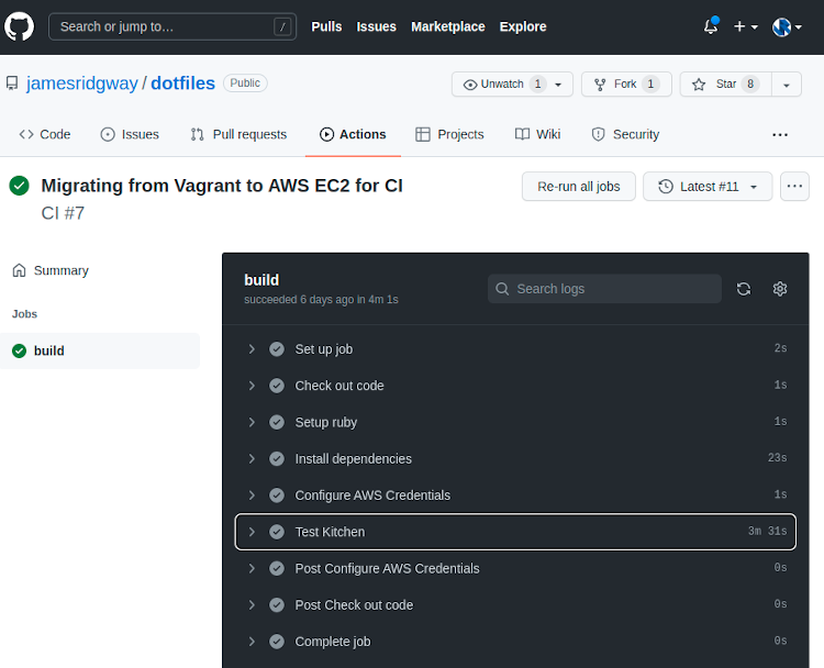 I want to be able to run Test Kitchen as part of a CI process. When I first created my dotfiles repository, GitHub Actions didn't exist, so I went with Travis CI. However, I will be replacing Travis CI with GitHub Actions.