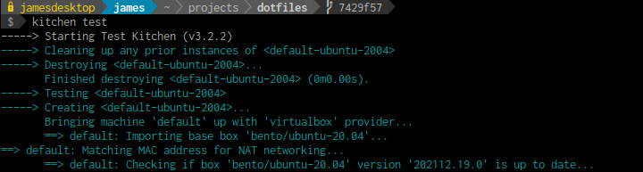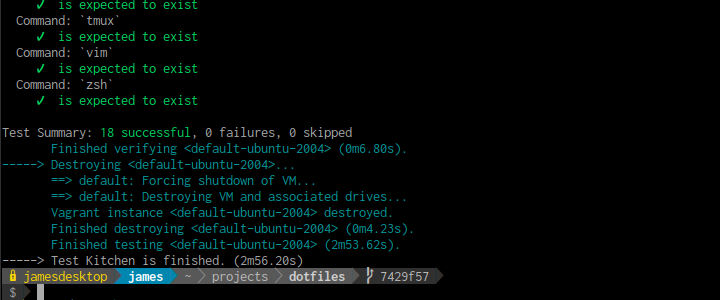 I've become familiar with Test Kitchen and InSpec for testing infrastructure and configuration management (Ansible, SaltStack, Puppet, Chef, etc). Whilst making a recent update to my dotfiles, I decided that I wanted a more robust testing process that tests the specific behaviours of the dotfiles setup process rather than just treating the script as a black box.