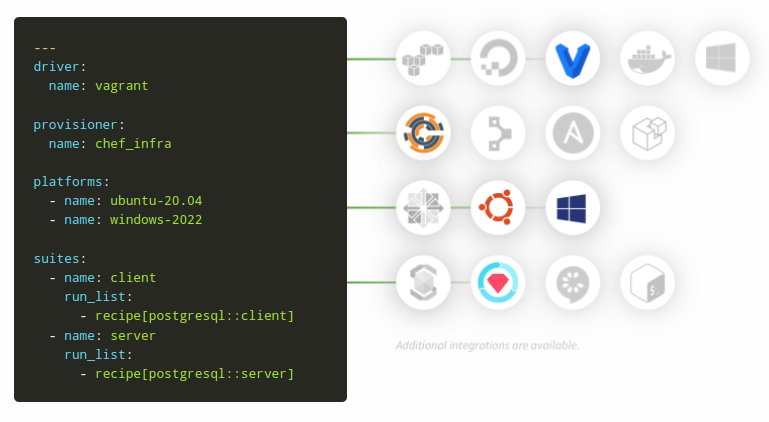Test Kitchen will take a YAML configuration file (typically .kitchen.yml) and will use this to run the defined test suites.